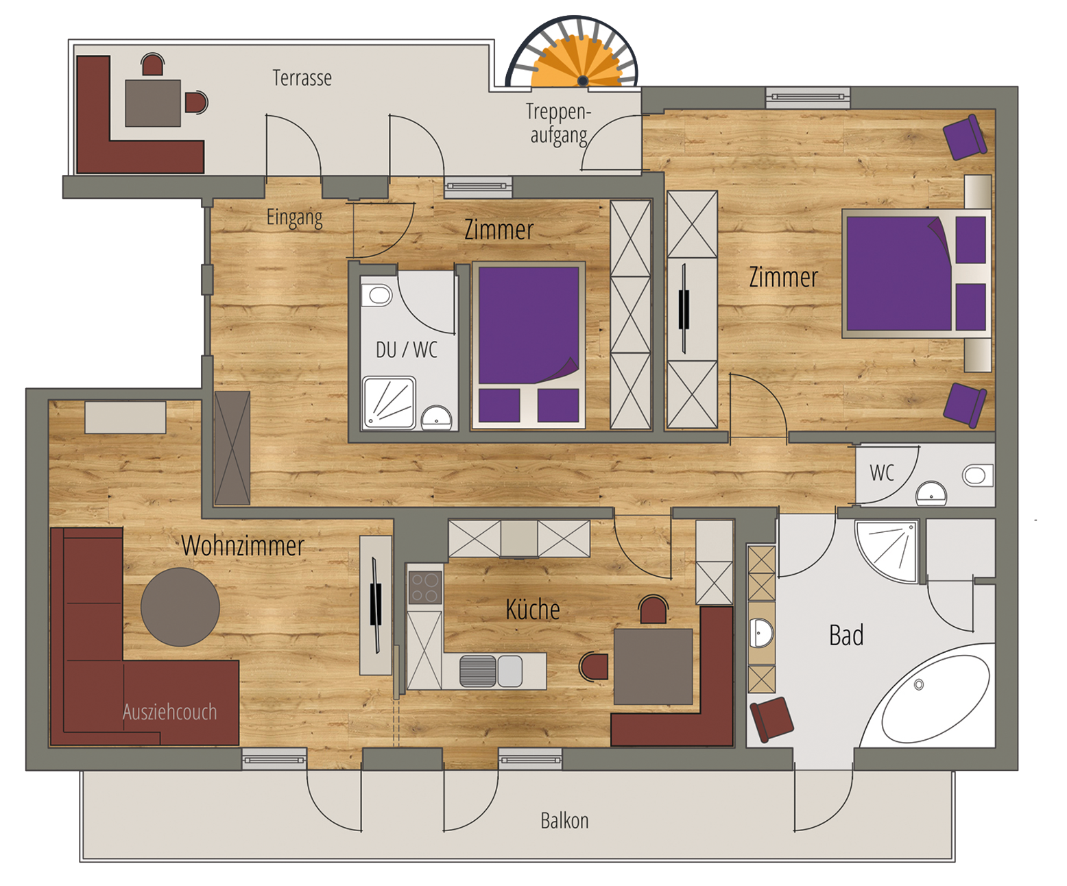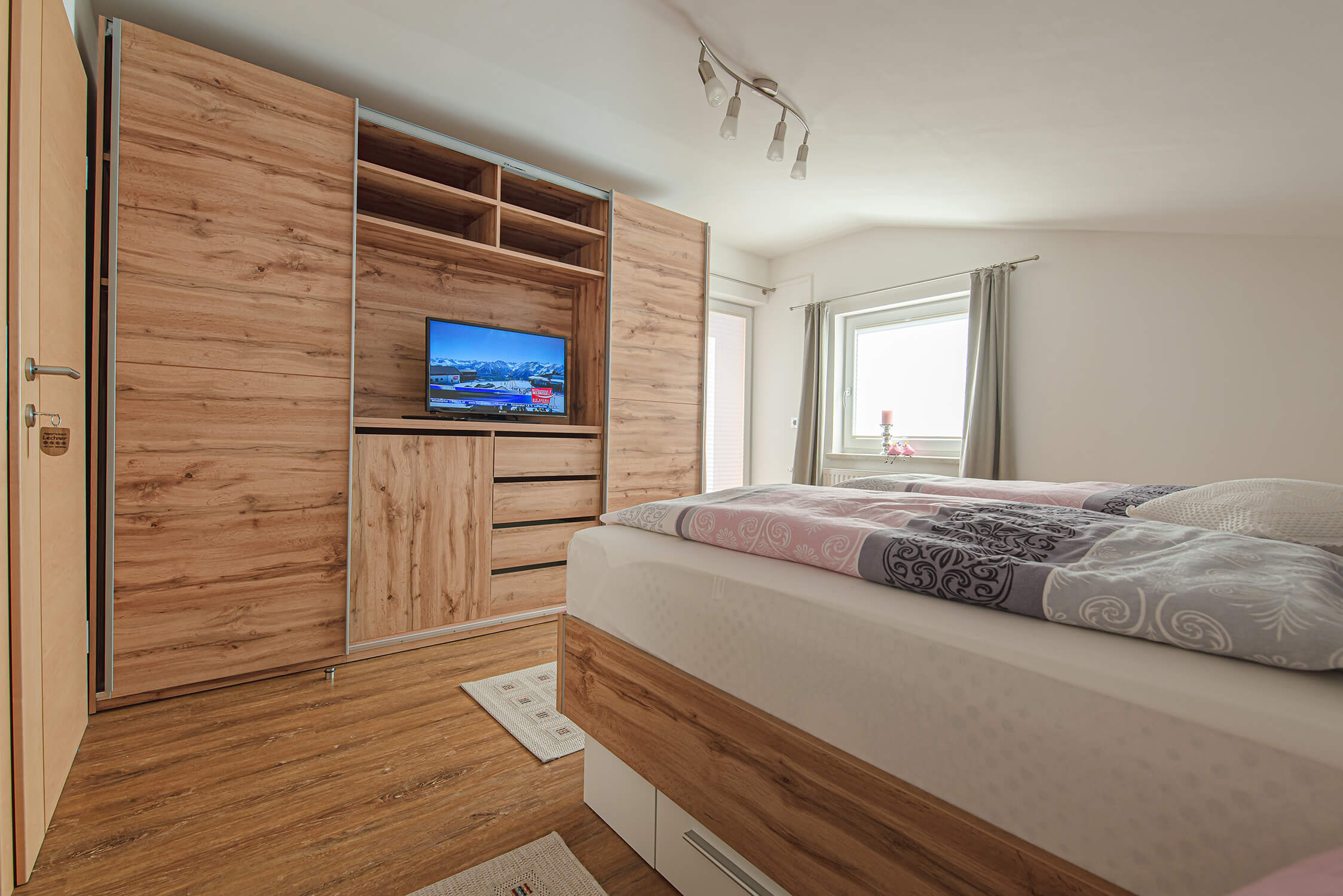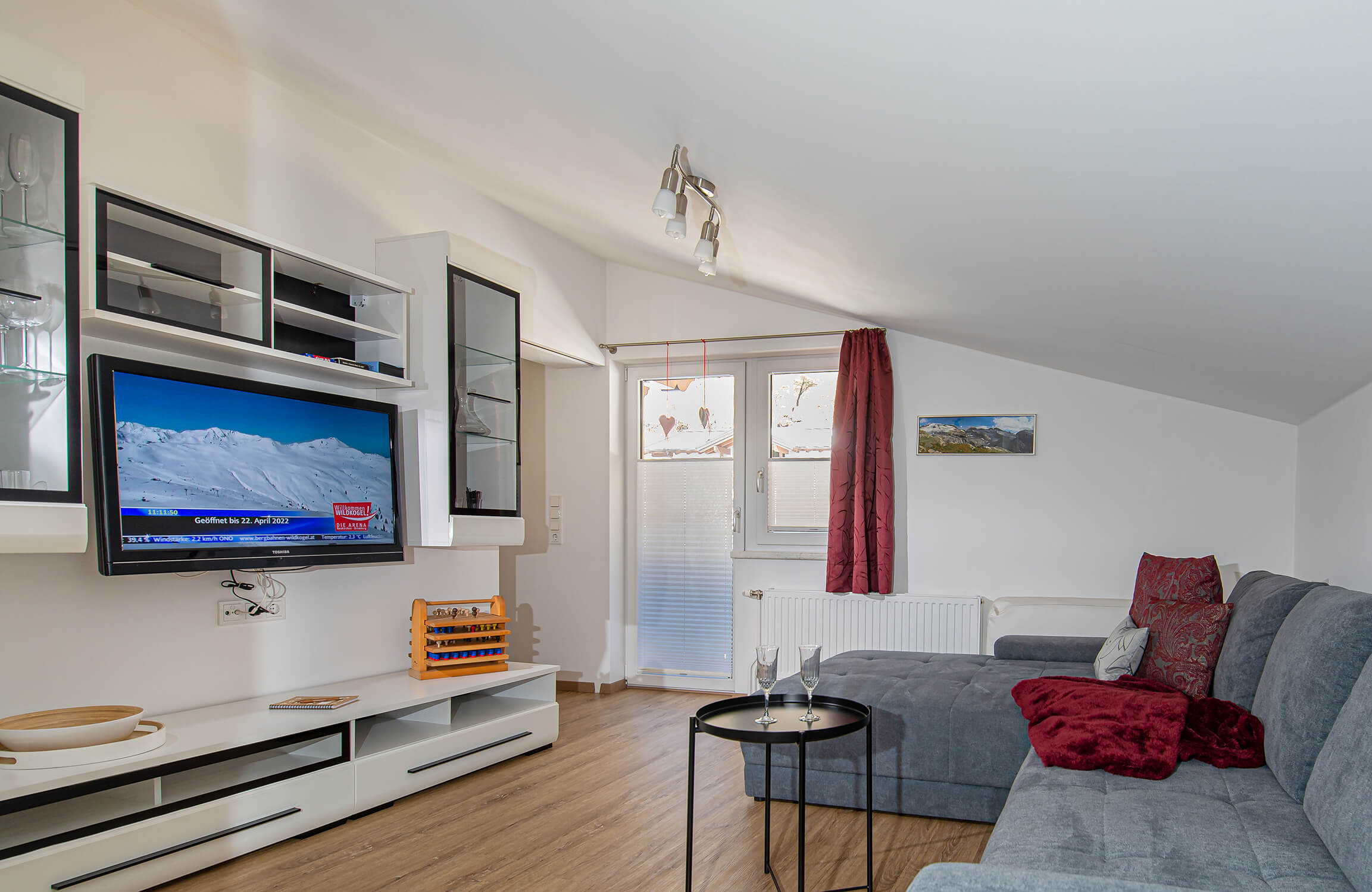 Die Ferienwohnung ist mit E-Herd, Backofen, Mikrowelle, Geschirrspüler, Kaffeemaschine, Wasserkocher und Toaster komplett ausgestattet. Die große Sitzecke bietet viel Platz zum Wohlfühlen. Das separate Wohnzimmer ist mit TV und einer Ausziehcouch ausgestattet. Zwei Schlafzimmer (2 x mit Doppelbett) sowie zwei Bäder und ein separates WC runden das Angebot des 90 m2 großen Appartements ab. Vom Balkon und der südseitigen Terrasse genießen Sie einen herrlichen Ausblick auf die Bergwelt. Als Willkommensgeschenk gibt es eine hausgemachte Köstlichkeit (Marmelade, Müsli).